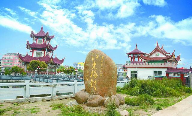 走进江东村村口,但见一块天然大青石矗立路边,上书“江东梅影”四个黄体大字。大青石后是一片水塘,名曰“南塘”,南塘方圆百亩,平坦宽阔,清澈如玉。一座后人为纪念梅妃而建的“梅亭”坐落在南塘之上。“梅亭”大门口两旁蹲守两尊石狮,张牙舞爪、气势威武。大门上方悬挂一块青石匾,上题“梅亭”二字。大门两侧刻有“南塘明月宁海朝阳十里水乡皆为本,浦口钟灵江东毓秀千秋人物尽风流”的对联。跨进大门,是一庭院,亭台楼阁、小池假山、廊桥壁画等尽入眼帘,美不胜收。小院正后方即是一座三层高的“梅亭”,亭子飞檐翘角,雄伟气派。亭前两条青石飞龙怒目相视、夭矫生动。登上“梅亭”,极目远眺,十里水乡尽收眼底。