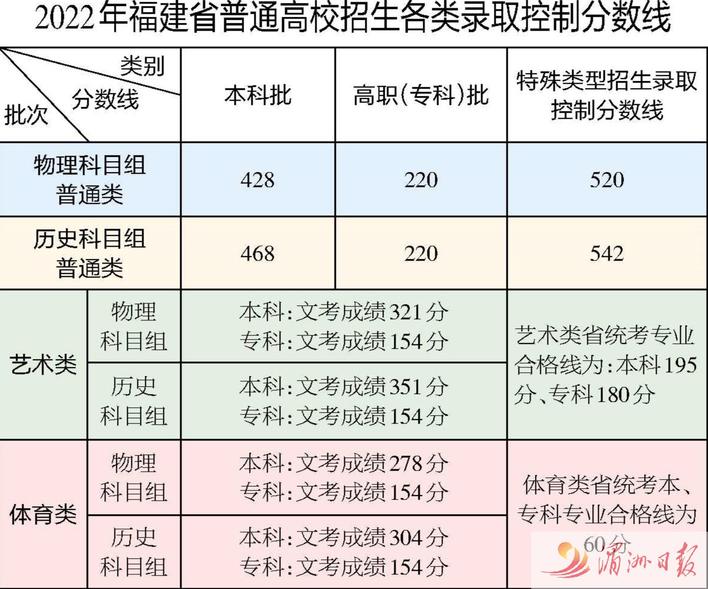 莆田网讯 昨日下午,2022年福建省普通高校招生考试成绩公布,普通高校招生各类录取控制分数线也划定(见图表)。今年是福建“新高考”第2年,其中物理科目组普通类本科批比去年增加5分,历史科目组普通类本科批比去年增加1分。